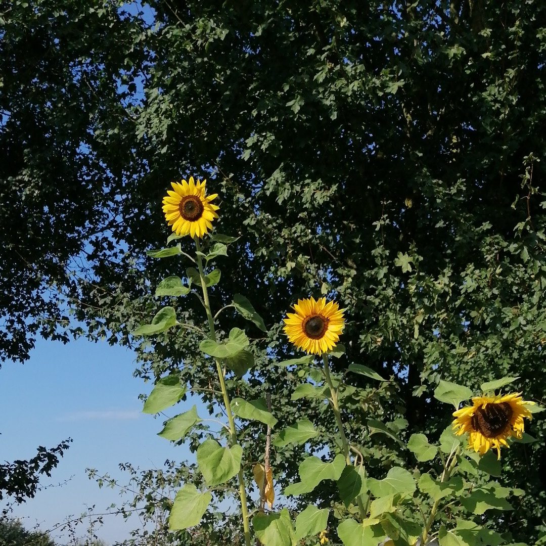 Photo’s of sunflowers grown from seeds taken home from Messy Church in May 2024!